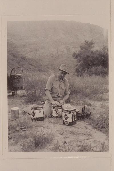 Bestor Robinson stowing food into slip-cover can for the first motor traverse of Grand Canyon