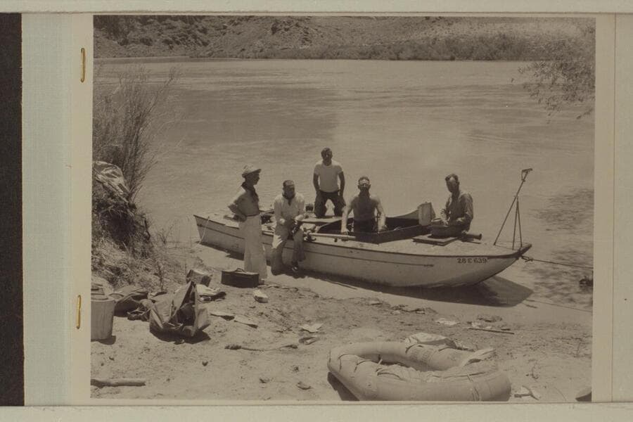 Otis Marston, Margaret Marston, and Ed Hudson checking the "Esmeralda" after trail runs at Lees Ferry