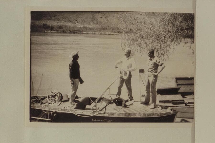 The crew of the motorboat "Hudson" before the start from Lees Ferry. Dock Marston; Joe Desloge; Guy Forcier. The "Esmeralda" is at the right