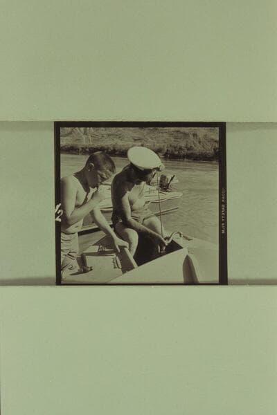 Buzzy Belknap watches Sanderson bail the forward hatch of one of the boats at Lees Ferry
