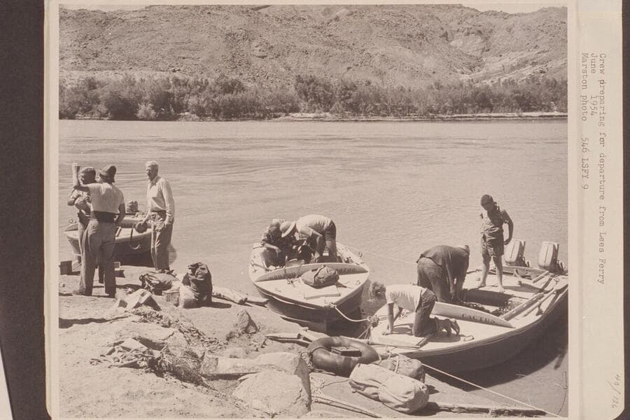Crew preparing for departure from Lees Ferry: Sanderson; Taylor; Desloge; Visbak; Cutler; Jim Jordan; Belknap; Buzz Belknap
