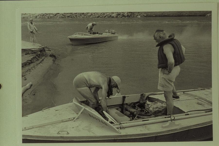 Preparation for departure from Lees Ferry. Marston-Disney cruise. Larry Sanderson; Rod Sanderson; Roy Bolton; Ballard Atherton