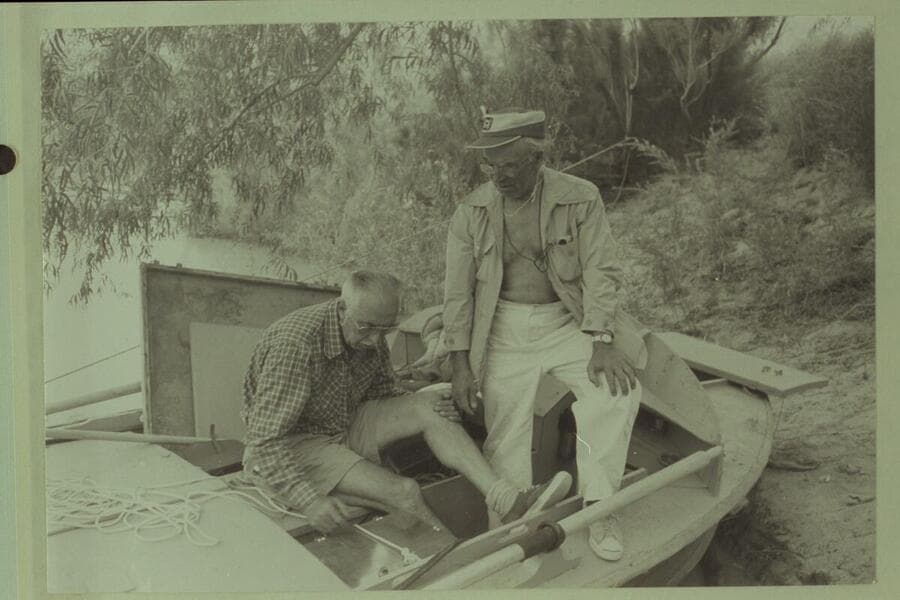 Masland and Marston study a lashing for the sound machine. The boat is the "Bootoo." Lees Ferry