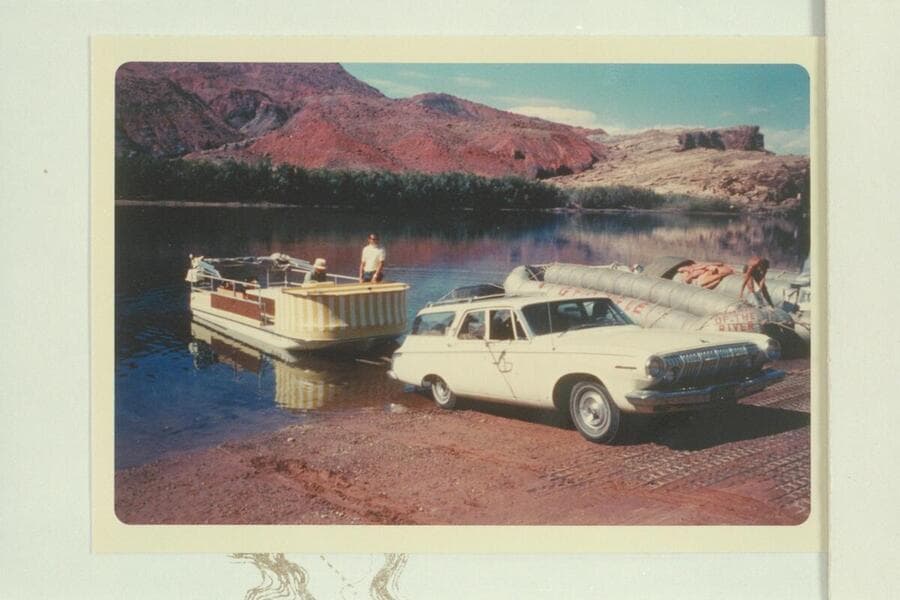 The deck boat is launched at Lees Ferry. Georgie White works on her boloneys at right