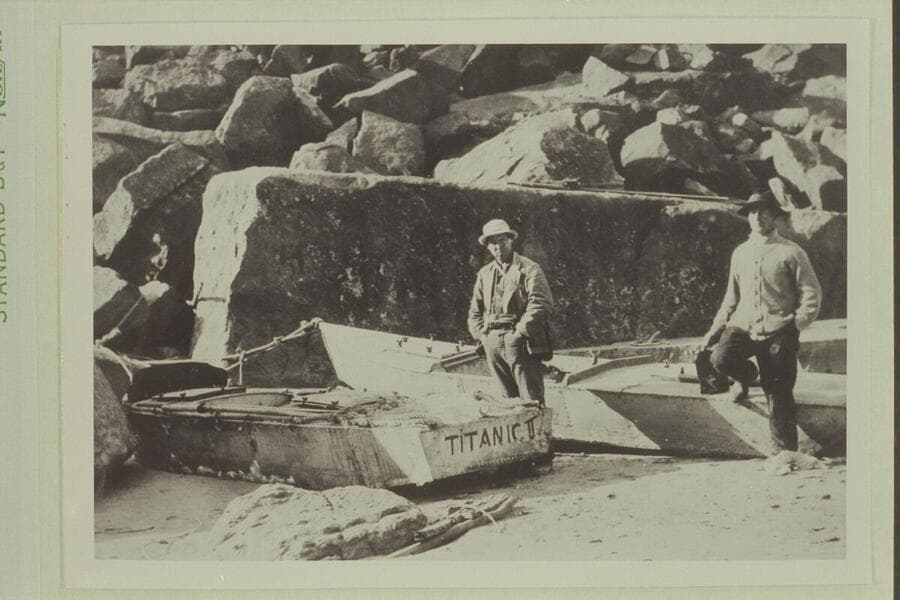 Pulling boats out of river at Badger Creek, the "Titanic" and "Ross Wheeler". Note the ice