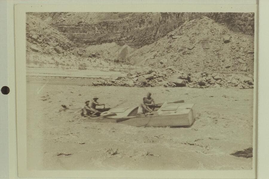 The "Esmeralda" pulling into the current at the lower end of Badger Rapid after picking up two member of the crew from the beach at the right
