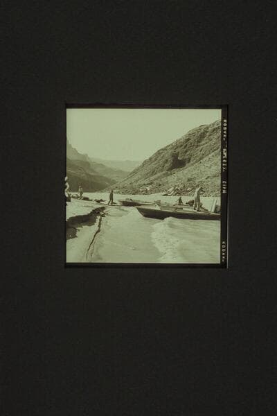 The motorboat "Hudson" and the helicopter at the mouth of Tapeats Creek in Grand Canyon. Joe Desloge stands on the beach
