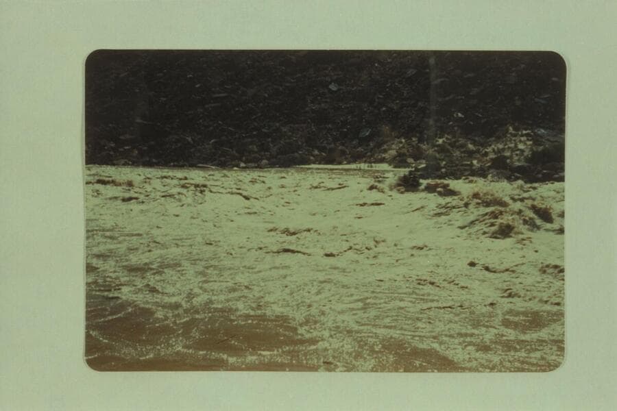 Red Carson piloting the helicopter over the "Esmeralda" at the head of Hance Rapid. Joe Desloge and Ed Hudson are in the boat. Marston and Taylor in the background