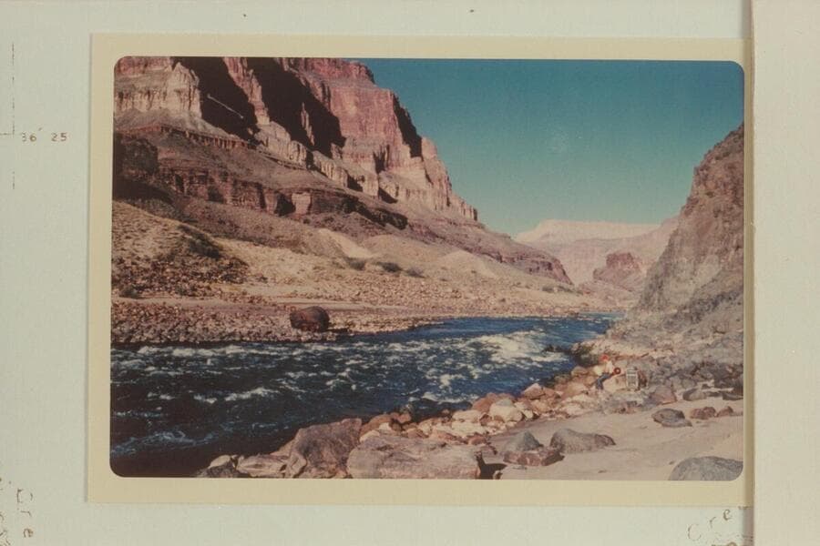 Downstream from foot of beach below Tapeats Creek. The Narrows are in the middle distance