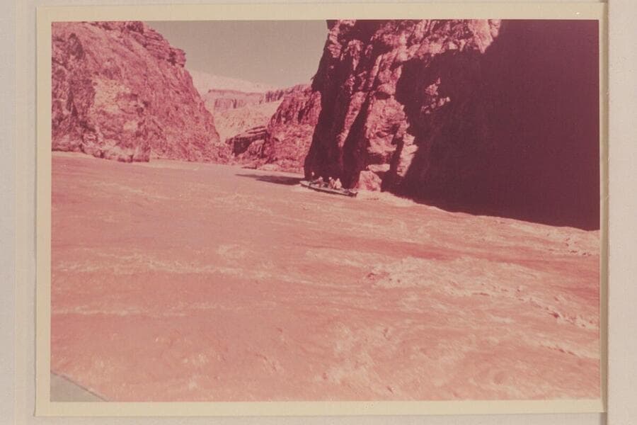 The "Rattlesnake" in Hance Rapid. Rod Sanderson is piloting, John Doerr sits starboard, Joe Desloge is center and Hugh Cutler is right