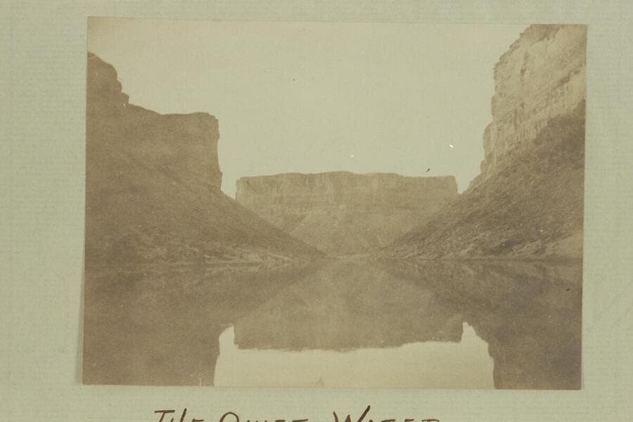 The Quiet Water above Soap Creek Rapid. Which way does the canon turn? Snap-shot from boat by R. B. Stanton, 1889. Dupe presented by Anne Stanton Burchard, 1959, Jan