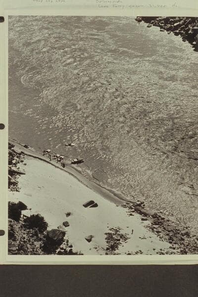 Marston on the rim photographing the Wright and Rigg boats beached at the foot of Badger Creek Rapid