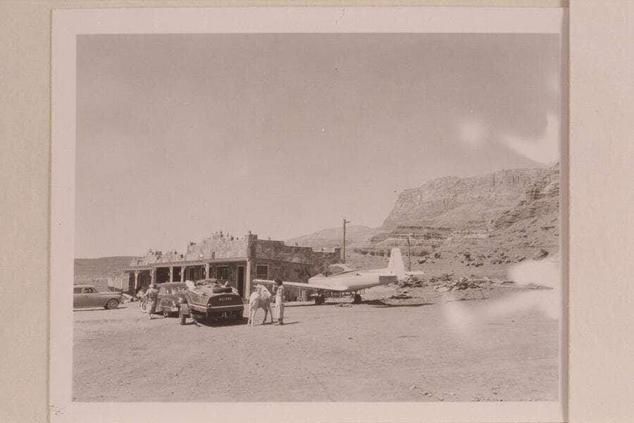 Art Greene's Cliff Dwellers Lodge. Motor car; speed boat ready for Grand Canyon traverse; plane in from Los Angeles