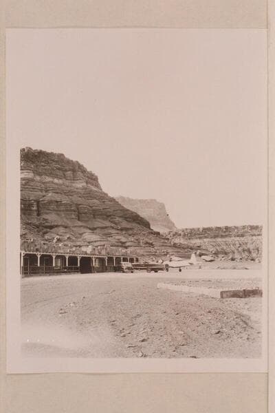 Art Greene's Cliff Dwellers Lodge. Motor car; speed boat ready for Grand Canyon traverse; plane in from Los Angeles