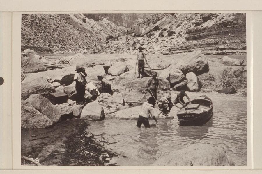 Portage at Soap Creek Rapid--USGS--Boats were lined and portaged over head of Soap Creek Rapids. Lint album. 3 1/4x5 1/2 print
