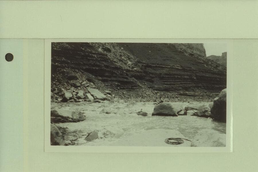 Portage at Soap Creek Rapid--USGS--Boats were lined and portaged over head of Soap Creek Rapids. Lint album. 3 1/4x5 1/2 print