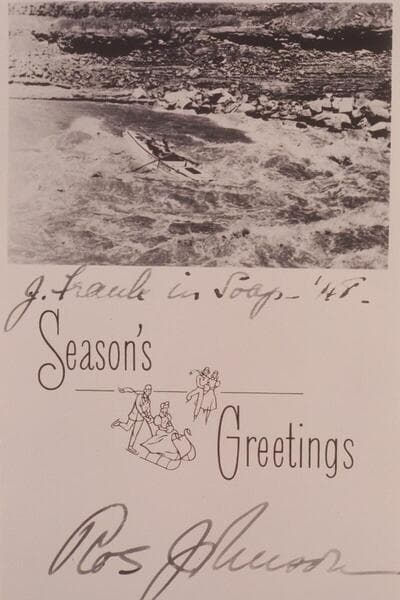Ros Johnson's Christmas card of 1953 reproducing Marston's photo of Frank Wright running Soap Creek Rapid in 1948, July