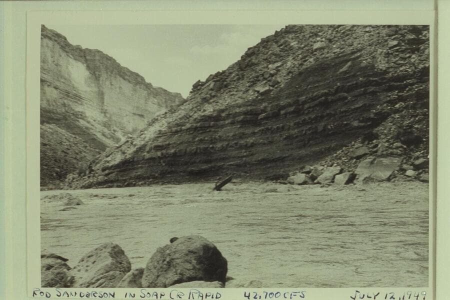 Rod Sanderson wioth outboard motorboat in Soap Creek Rapid