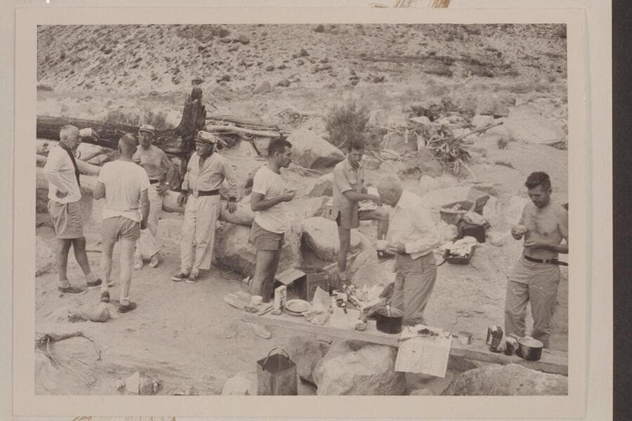 The crew of the 1956 Grand Canyon motor cruise. At camp above Soap Creek Rapid
