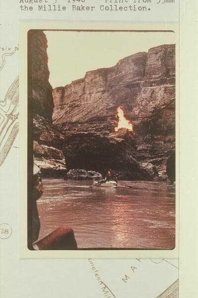 The pile of drift on top of the boulder at Boulder Narrows burning after ignition by the 1940 Nevills party. Lees Ferry gauge: 2m600 cfs