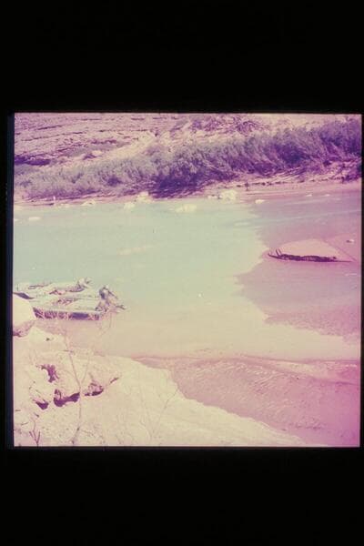 The three boats of the 1954 outboard fleet moored in the clear lagoon at the mouth of the Little Colorado