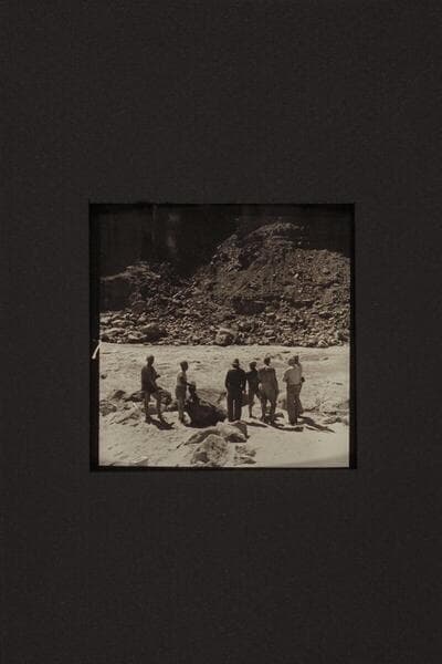 The crew looking over the 24.5 Mile Rapid in Marble Canyon. Left to right: Belknap, Eisaman, Taylor, Marston, Masland, Desloge and Sanderson