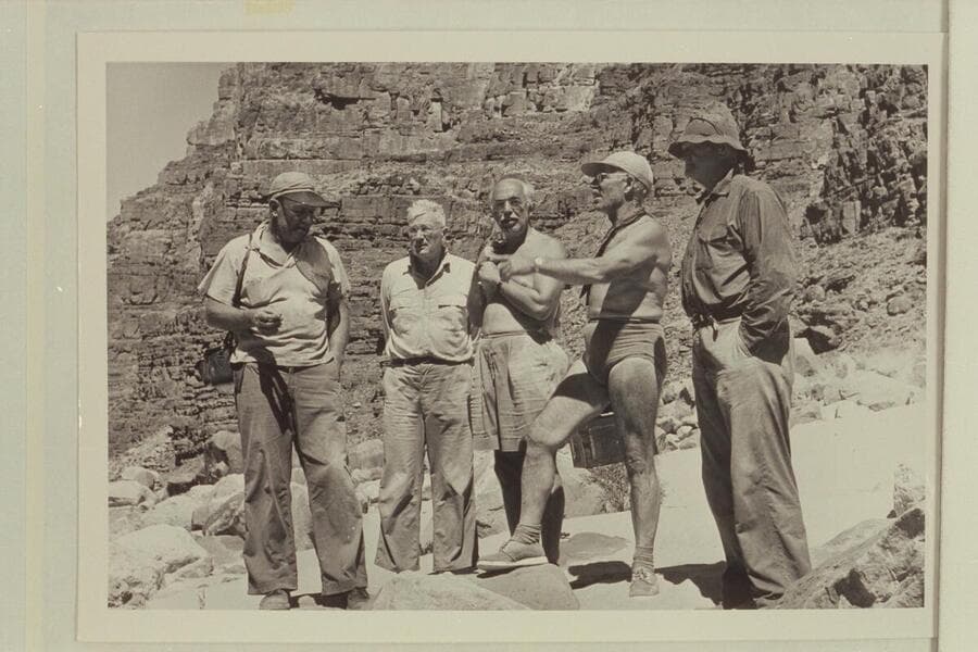 The crew looking over the 24.5 Mile Rapid in Marble Canyon. Left to right: Belknap, Eisaman, Taylor, Marston, Masland, Desloge and Sanderson