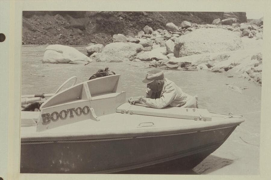 Marston fastening the hatch of the "Bootoo", Mile 24.5 in Marble Canyon