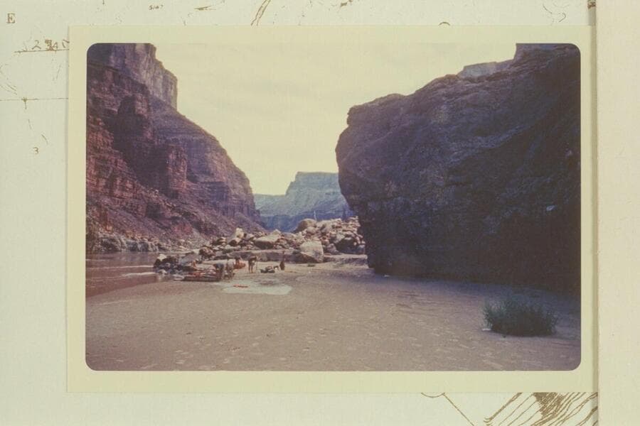 Camp on sand bar at overhanging rock above 25 Mile Rapid. The rock at right may be Hansbrough-Richards Ledge, Mile 24.85