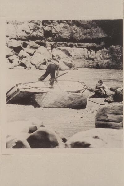 Working the "WEN" off the rocks in Marble Canyon, Mile 24-25. Nevills sits at left, Southworth wears the white shirt