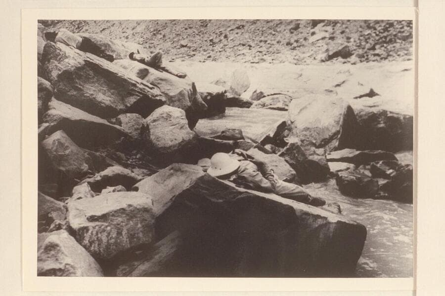 Some obvious posing to demonstrate the checking of a rapid; Nevills party of 1938