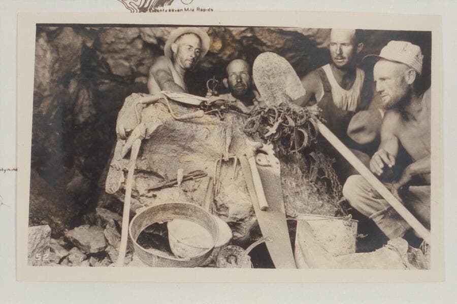 Cache which Frederick T. Barry claimed his party left at the cave at Cave Springs Rapid in 1888 and which was found by the USGS party Aug. 6, 1923. Emery Kolb and Raymond Moore at the back. Frank Dodge at right and Frank Word is next to him
