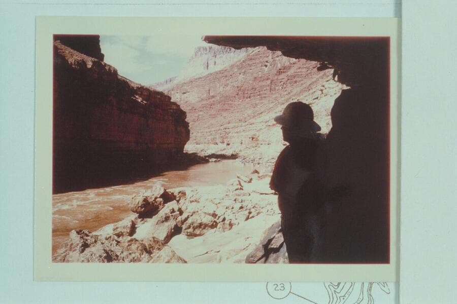 Bill Belknap at the mouth of the cave at Cave Spring Rapid in position similar to Kolb appearing in photo of Nov. 11-13, 1911