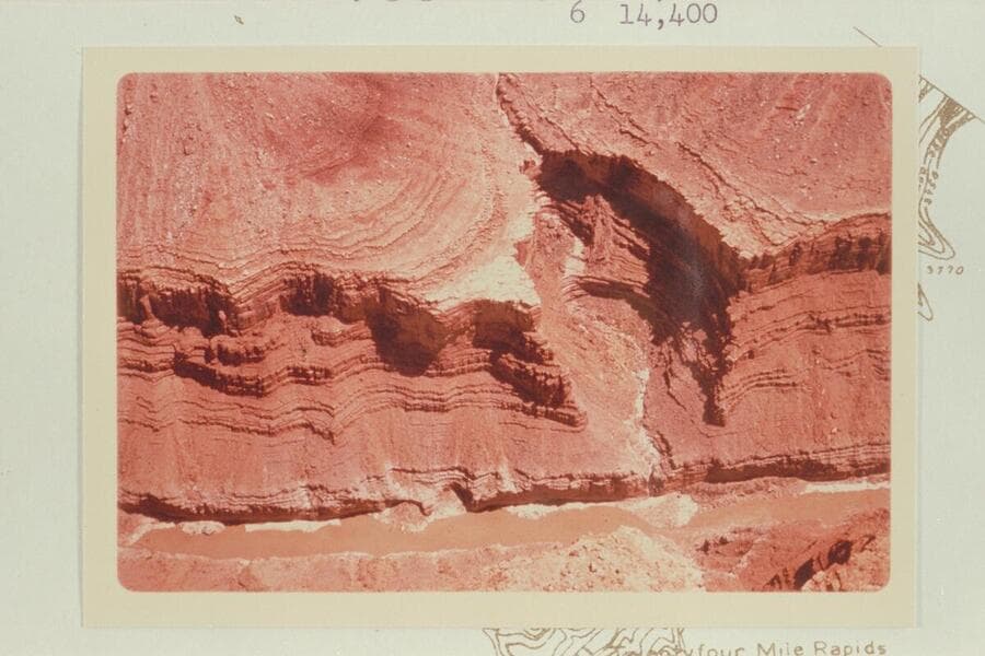 Upriver across plunge pool at mouth of Tiger Wash. Boulder fan at 27 Mile Rapid. Mile 26.7