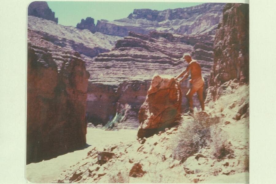 Little John photographing the area where the Dead Man lies above Paradise Canyon. Boats in background. Preliminary Lees Ferry gauge: 122,000 cfs