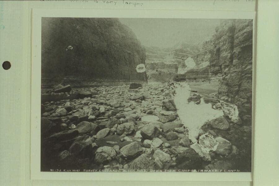 194. Down from Camp 40 in Marble Canon. Brown-Stanton Survey. The view is from right bank near Paradise Canyon. Stanton cached his supplies and equipment and left the river here. Vaseys Paradise is just around the bend of river
