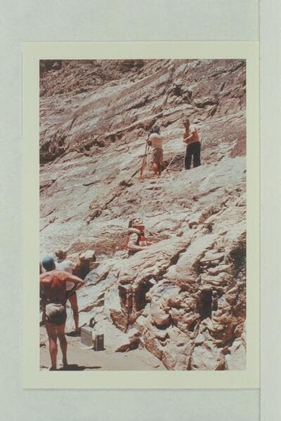 Rigging the camera. Paradise Canyon. Gordon Avil and Jim Algar on beach. Dick Kelley and Doc Reed on cliff
