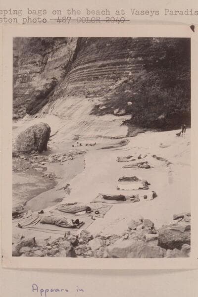 Camp on beach above Vaseys Paradise. Nevills party. Garth Marston sleeps nearest the camera