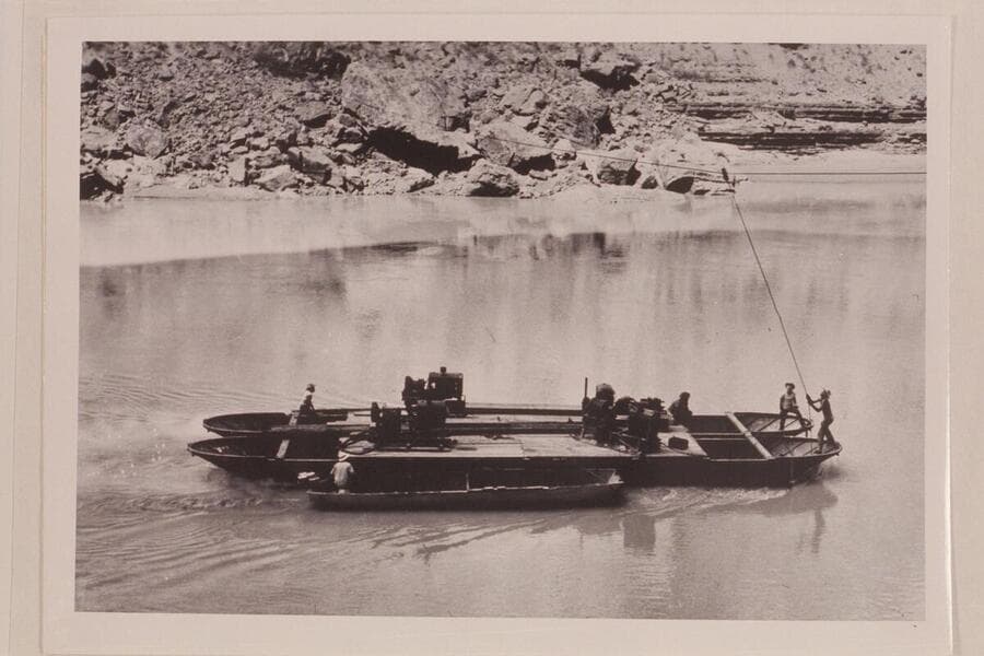Barge used in diamond drilling the river bed at the lower Marble Canyon damsite, near Mile 40 in Marble Canyon. Copied from print in collection of Rod Sanderson