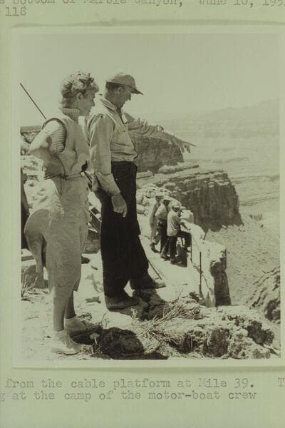 Bert Lucas points out to Margaret Marston the campsite of the motor crew in the bottom of Marble Canyon