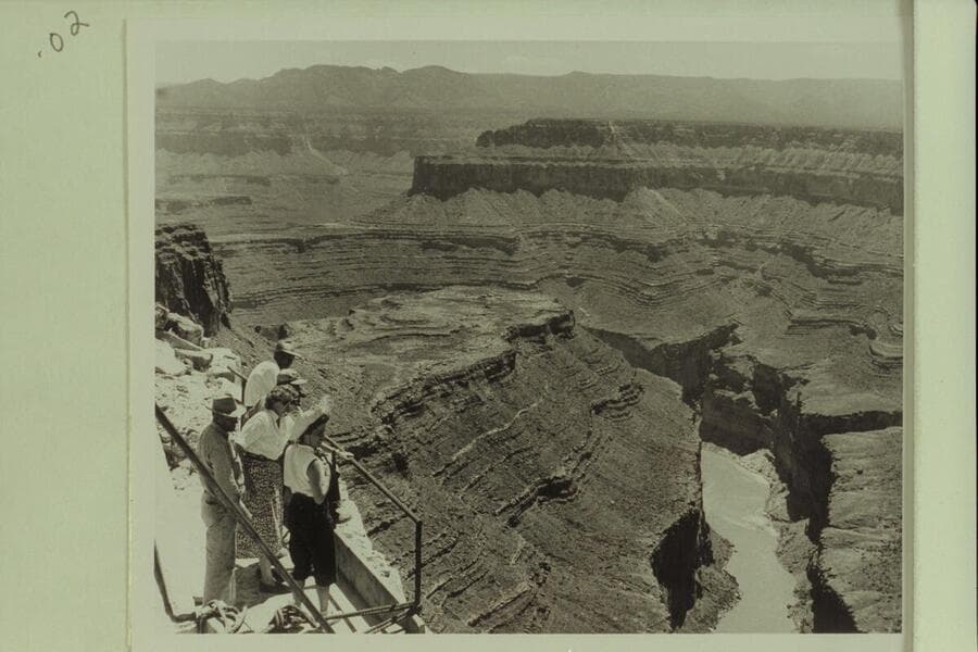 The Marble Gorge from the cable platform at Mile 39. The group are looking at the camp of the motorboat crew