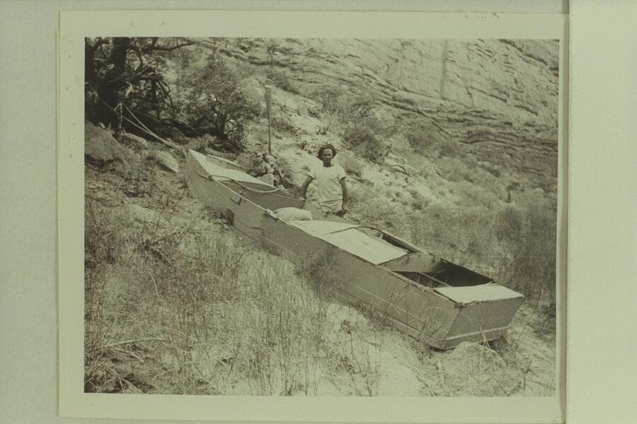 Nevills posing by the Loper boat at Mile 41