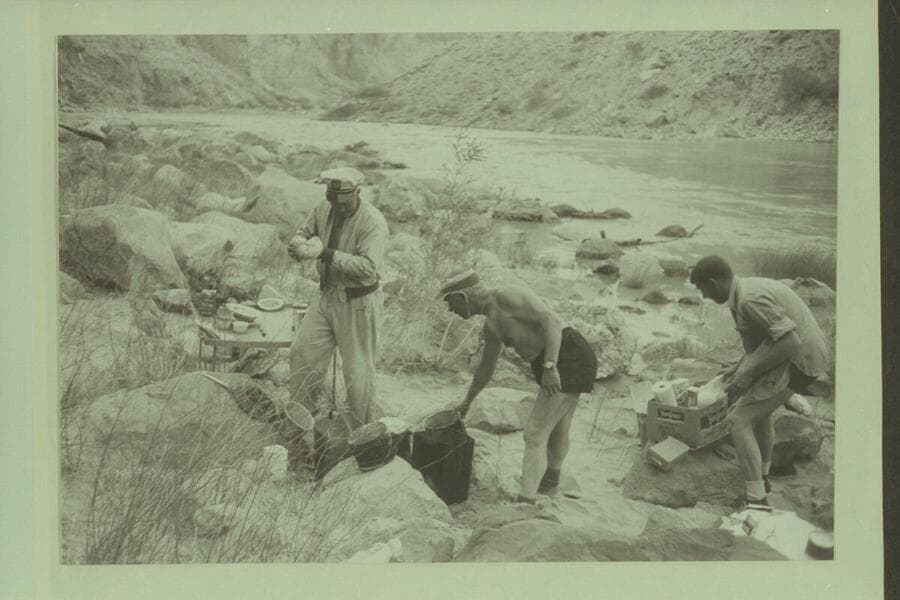 Bathing the dishes in the second camp in Marble Canyon: Sanderson, Marston and Beer; President Harding Rapid