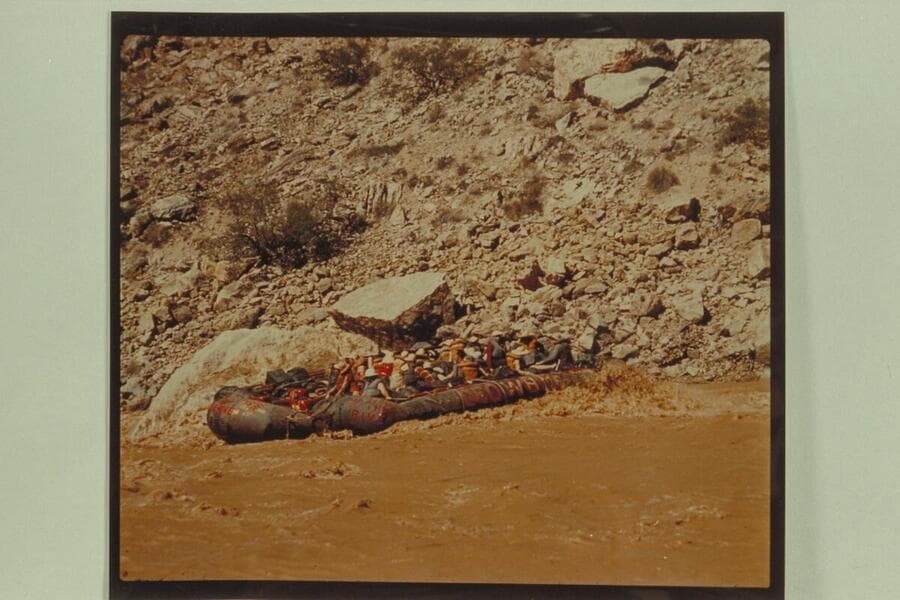 Georgie White's 3-boloney outfit. Through the Grand Canyon; photo made as they were negotiating President Harding Rapid