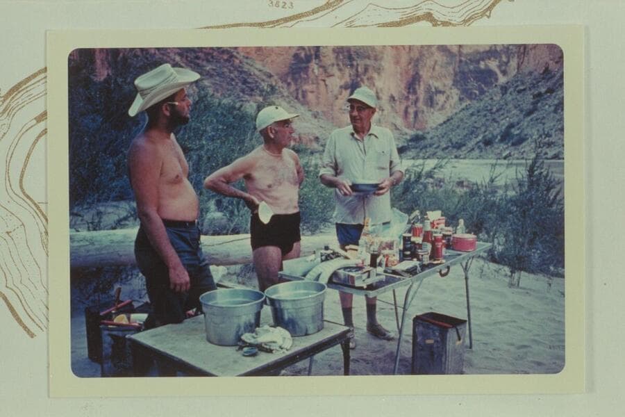 Camp at lower end of Vulcan Rapid. Bill Belknap; George Morrison; Jim Bechtel