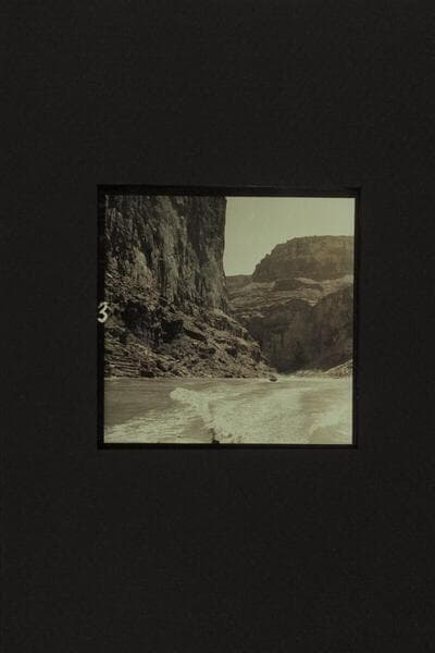 Cruising between President Harding Rapid and Nancoweap, Marble Canyon. The boat is the "Rattlesnake" with Rod Sanderson piloting and Joe Desloge and Hugh Cutler riding as passengers