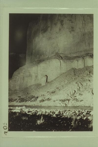 The cliff on the left bank at Nancoweap Rapid lighted by the drift fire. Photo by available light [on photo reverse: Cliffs lit up 1500 ft. high at Nancoweap drift fire]