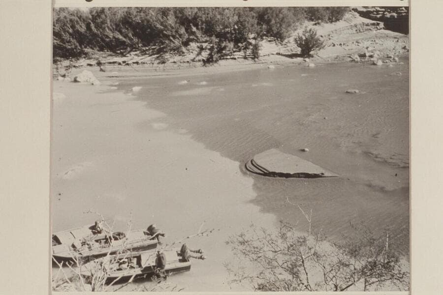 The three boats of the 1954 outboard fleet moored in the clear lagoon at the mouth of the Little Colorado River