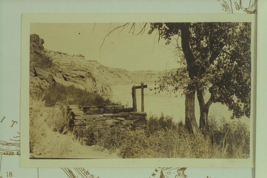 Foundation remnant of cabin on bank of Little Colorado below Tuba Bridge at Cameron