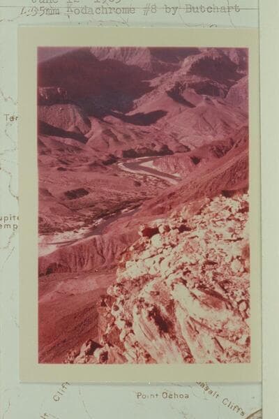 Ancient lava upthrust opposite end of Tanner Trail, Mile 68. Right bank of river in Grand Canyon